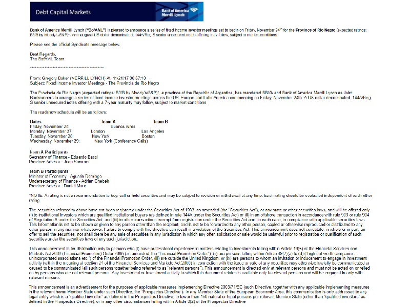 Actuaron como colocadores internacionales, el Banco of América Merrill Lynch, y BBVA, y colocadores locales Banco Patagonia y Banco Francés, destacándose la presencia de inversores locales acompañando a la provincia en esta colocación internacional.