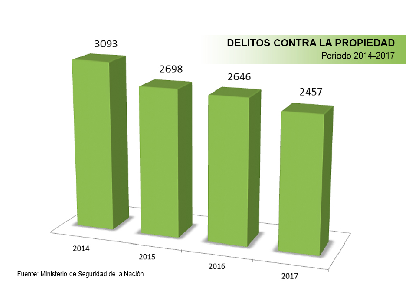 Con respecto a los delitos contra la propiedad, pasó de 3093 hechos por cada 100.000 habitantes en 2014 a 2.457 en 2017, lo que representa una disminución de 20,5%.
