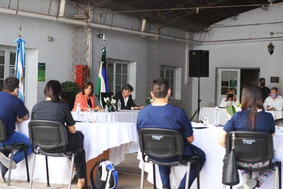 La Gobernadora Arabela Carreras participó de la reunión de la Mesa de análisis para abordar temáticas vinculadas a la situación del personal de Salud, en el marco del tratamiento del Convenio Colectivo de Trabajo. La Mandataria anunció la decisión del Gobierno Provincial de establecer un plus para trabajadores esenciales, y una mejora para los Jefes de Servicios de los hospitales.
