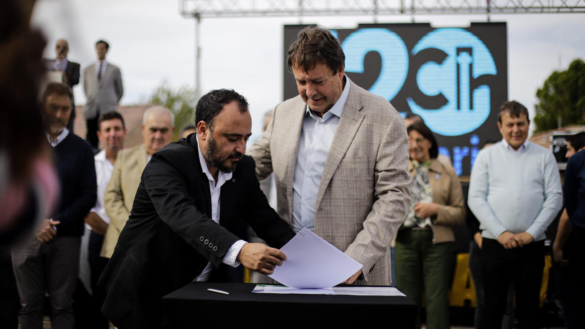 El Gobernador Alberto Weretilneck y el Intendente Adrián Casadei firmaron en San Antonio Oeste el contrato para construir la nueva red cloacal y la estación de bombeo que beneficiará a 864 familias, una obra clave para mejorar el saneamiento y la calidad de vida en la ciudad. La obra, financiada con recursos del Bono VMOS logrado en acuerdo con las empresas que operan el oleoducto Vaca Muerta Sur, representa un paso histórico en infraestructura sanitaria y planificación urbana.